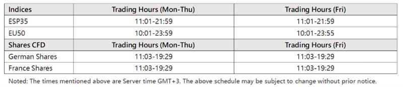 Please be informed that Europe Daylight Saving Time will be ended on October 26th 2025 (Sunday). Some instruments trading hours would be affected start October 27th 2025 to November 1st 2025. Please find the trading schedule as below.