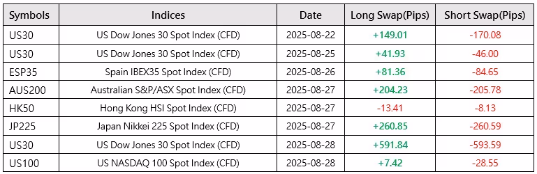 Our company will update the indices swaps around 18:00 (Beijing timeGMT+8). Clients can view the swap information in the Product Specifications section of the MT client platform. If you have any questions or need further clarification, please do not hesitate to contact us. Thank you!