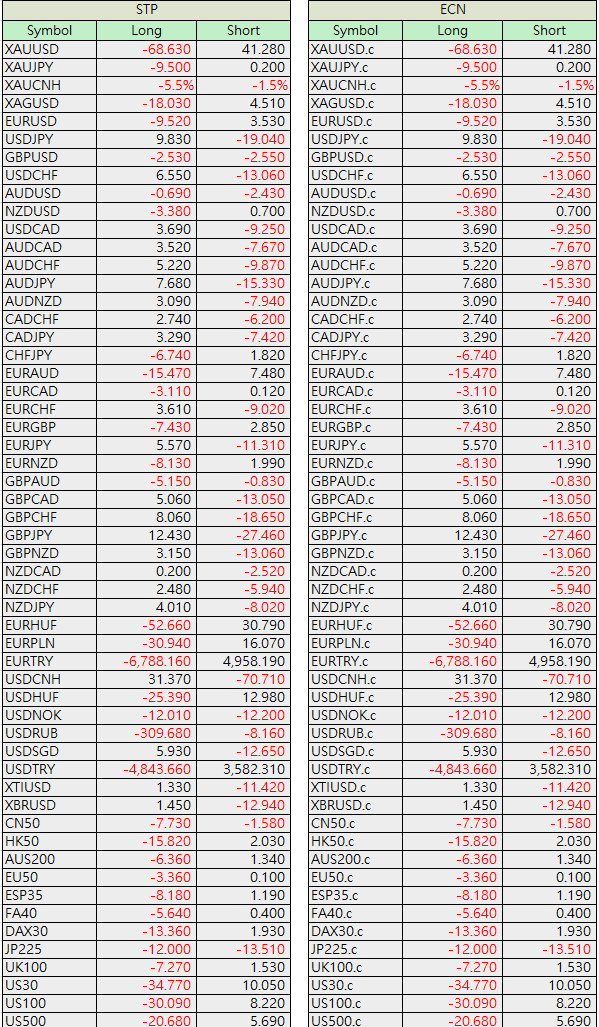 2. The values ​​providedare sourced from liquidity providers (LP) and may be subject to omissions orerrors. Any changes will be reflected on the trading platform. Our companyupdates the FOREX and METAL swaps weekly (Beijing time GMT+8).