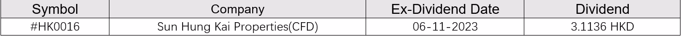 The following table is the information on upcoming dates of ex-dividend or other corporate actions for the underlying stocks of our Share and ETF CFD.