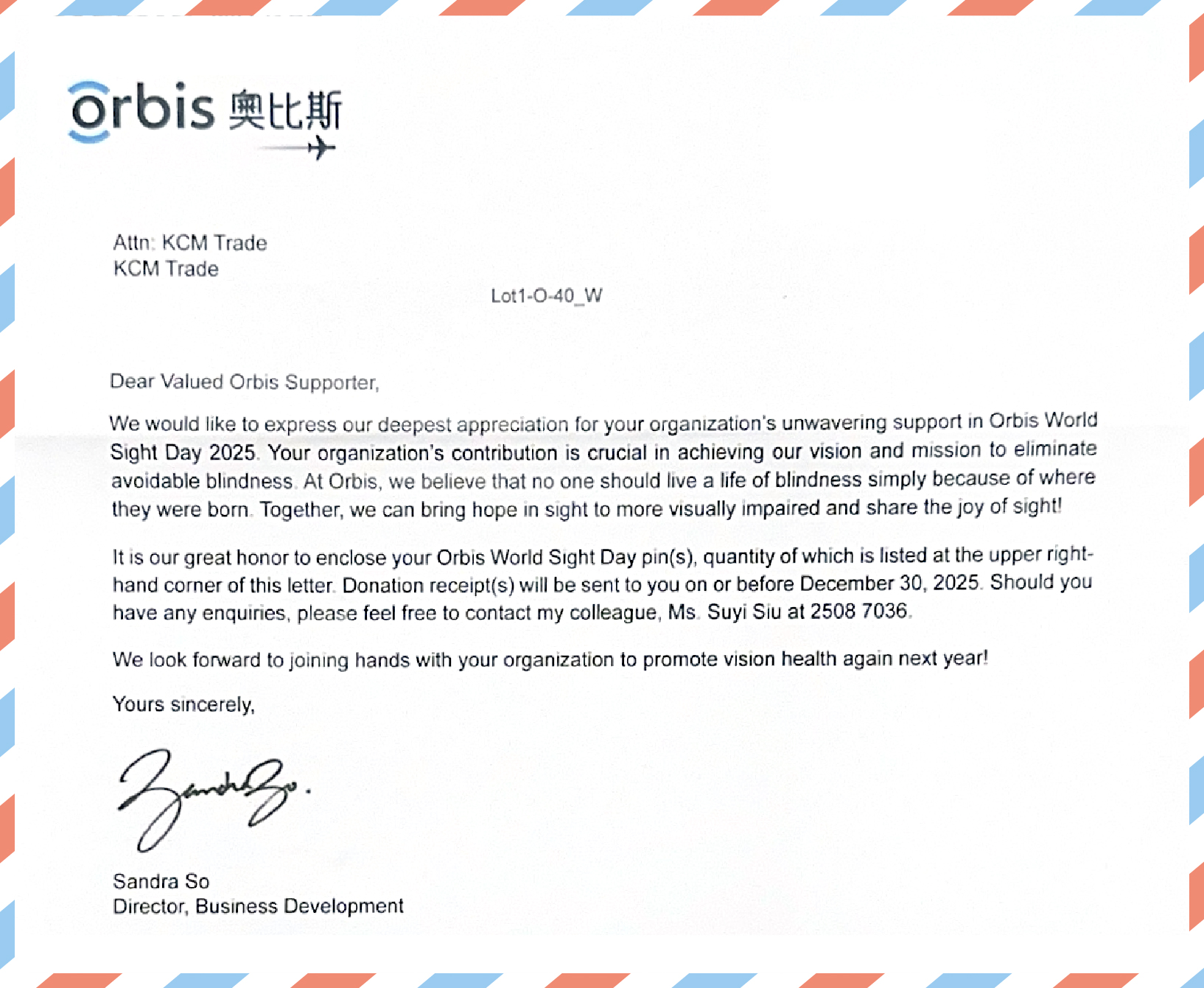 การยึดมั่นต่อความมุ่งมั่นต่อความรับผิดชอบต่อสังคมขององค์กร KCM Trade สนับสนุนการพัฒนาบุคลากรระดับโลก การแลกเปลี่ยนชุมชนและวัฒนธรรม สวัสดิการเด็ก และการปกป้องสิ่งแวดล้อมอย่างแข็งขัน โดยมีเครือข่ายครอบคลุมฮ่องกง ออสเตรเลีย ไทย และประเทศอื่นๆ ในปีนี้ กลุ่มบริษัทมีความภาคภูมิใจที่ได้มีส่วนร่วมในวันสายตาโลก Orbis World Sight Day 2025 ในวันที่ 9 ตุลาคม 2568 ซึ่งเป็นกิจกรรมที่จัดขึ้นเพื่อสร้างความตระหนักรู้เกี่ยวกับสุขภาพดวงตาและการป้องกันภาวะตาบอดที่ป้องกันได้ทั่วโลก พร้อมกับช่วยเหลือชุมชนผู้ด้อยโอกาสให้เข้าถึงการรักษาที่เหมาะสม